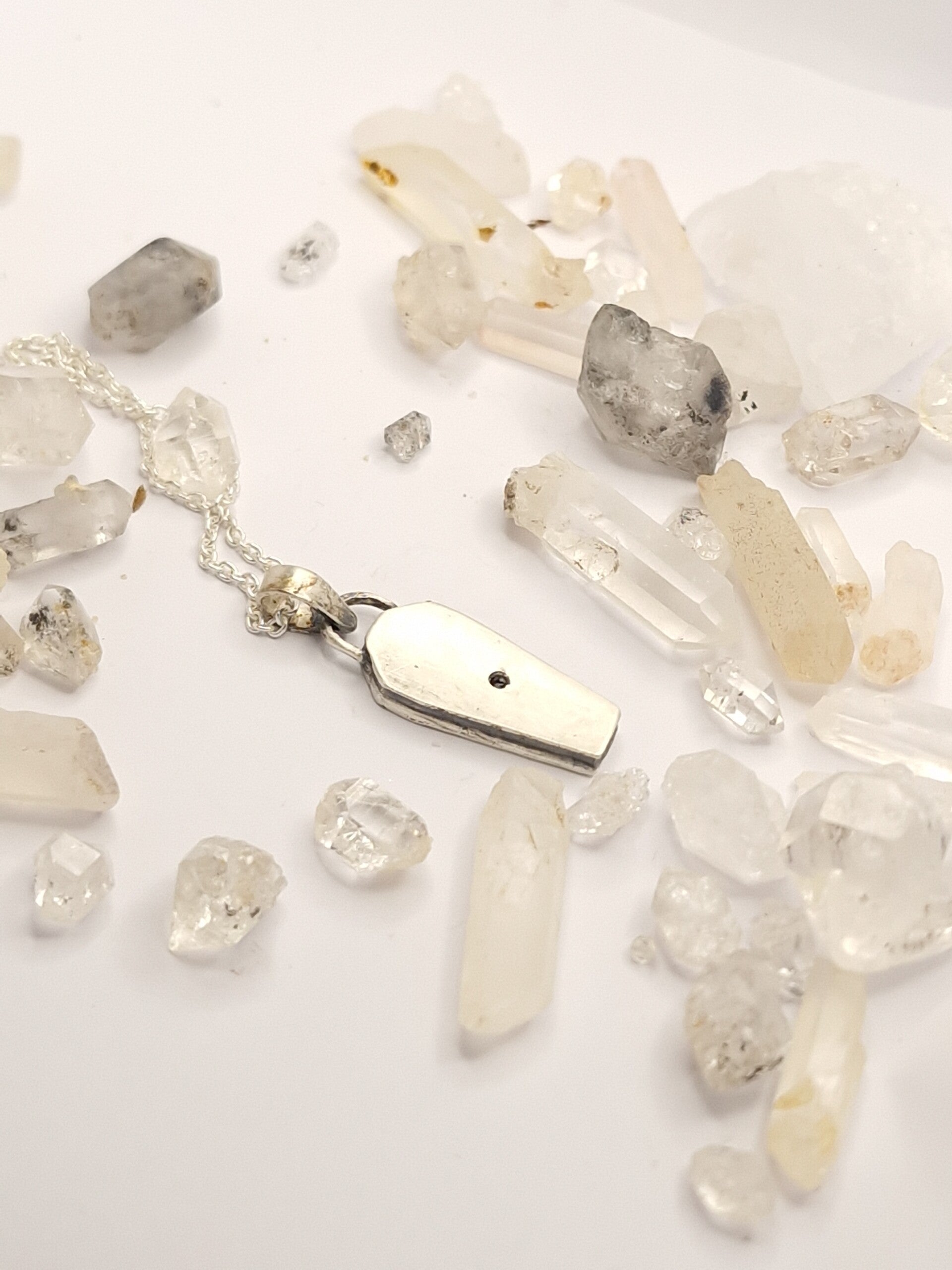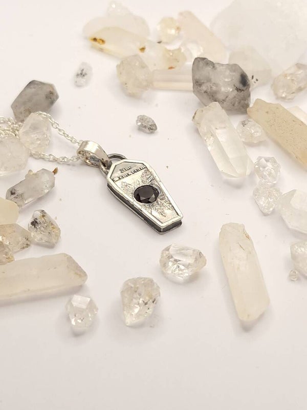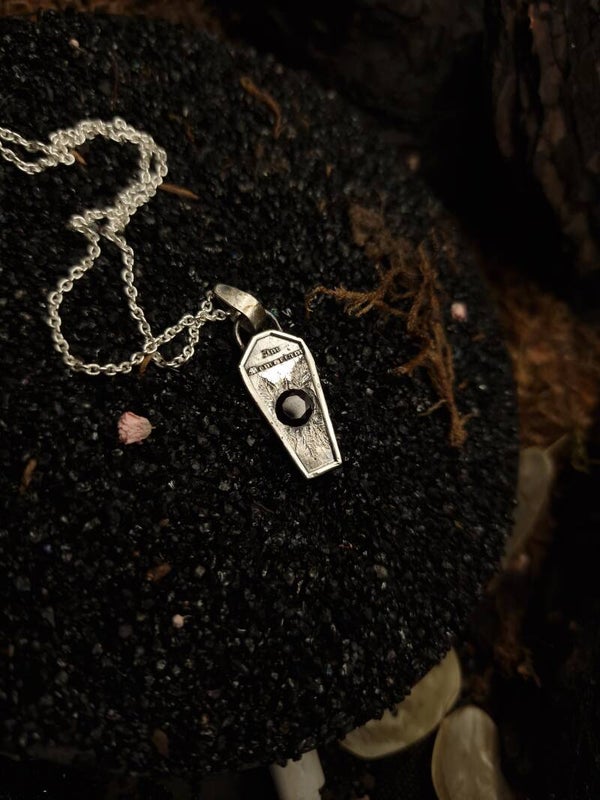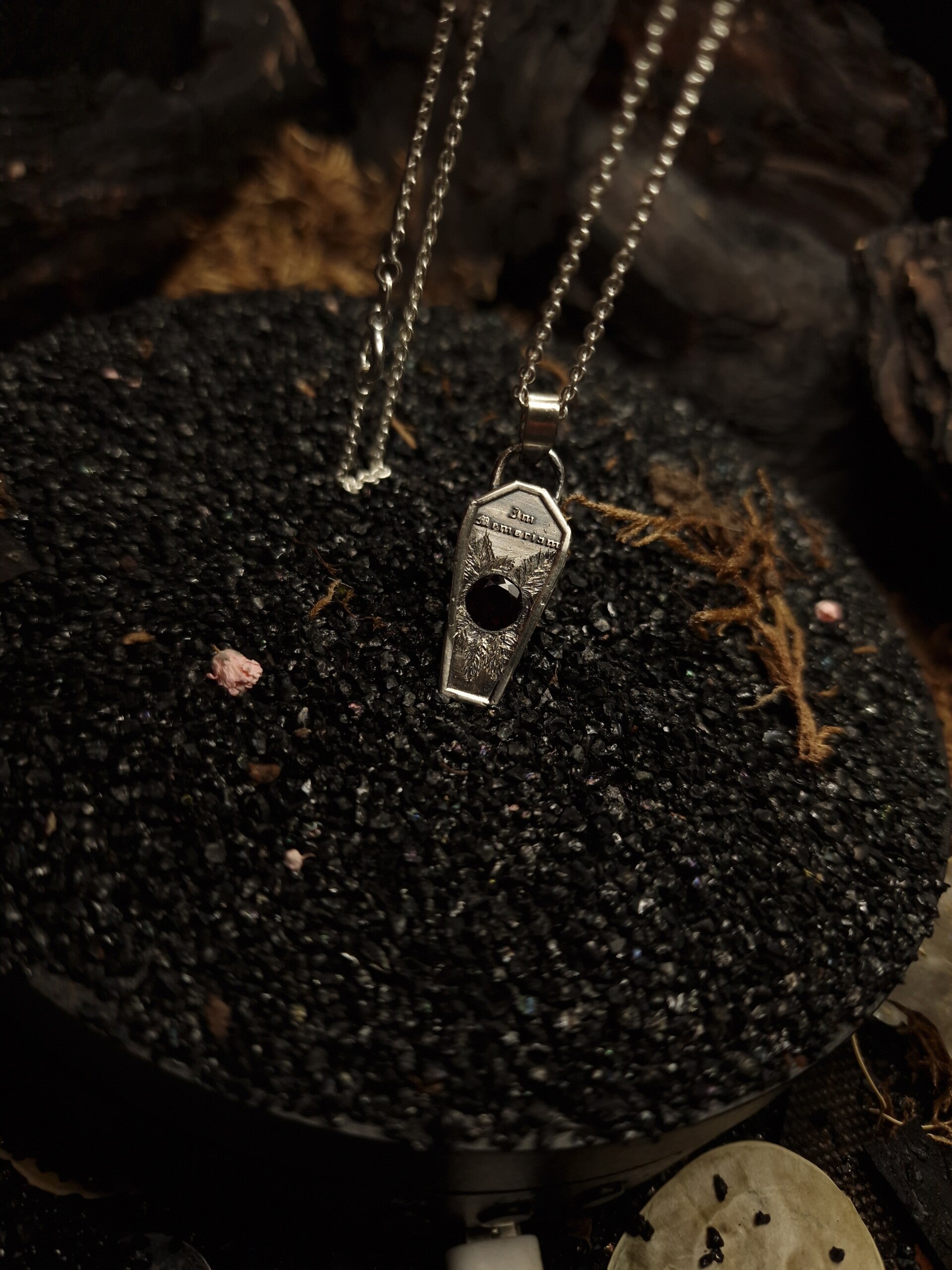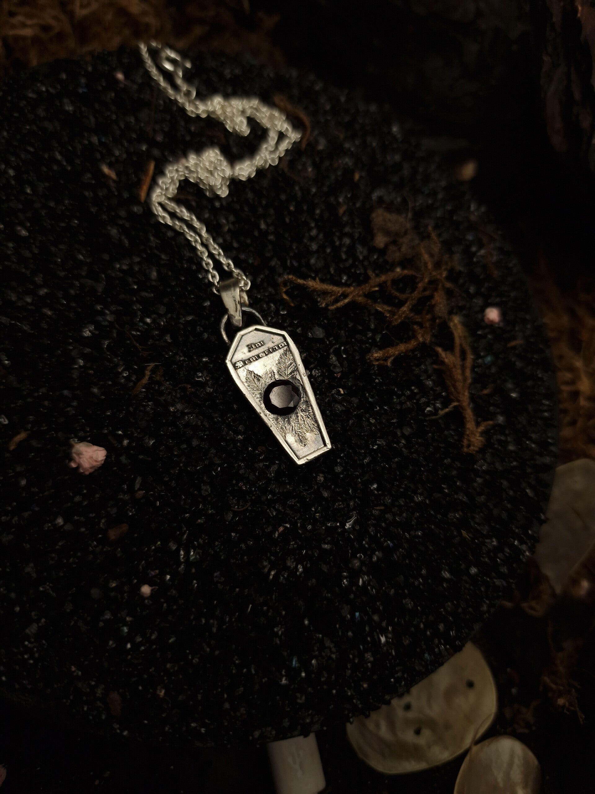 Among the treasures within this collection is the Im Memoriam Coffin Necklace with Garnet—a stunning homage to both life and death. This intricately designed necklace features a coffin-shaped pendant, symbolizing the passage of time, eternal rest, and remembrance. Set with a deep red garnet, known for its connection to protection and strength, the necklace is a powerful reminder of the cycles of life and the magic that dwells within the unknown. Whether worn as a personal amulet or a cherished keepsake, the Im Memoriam Coffin Necklace embodies the mysteries of the occult and the beauty found in the most unexpected places.