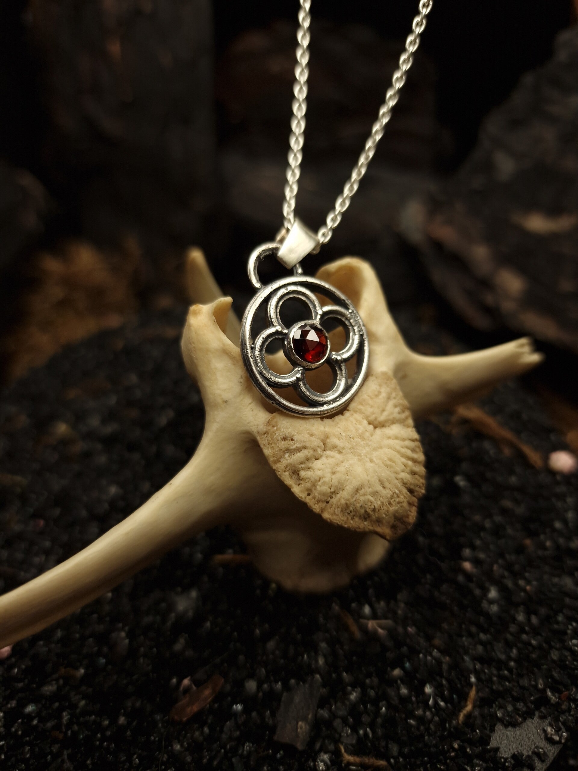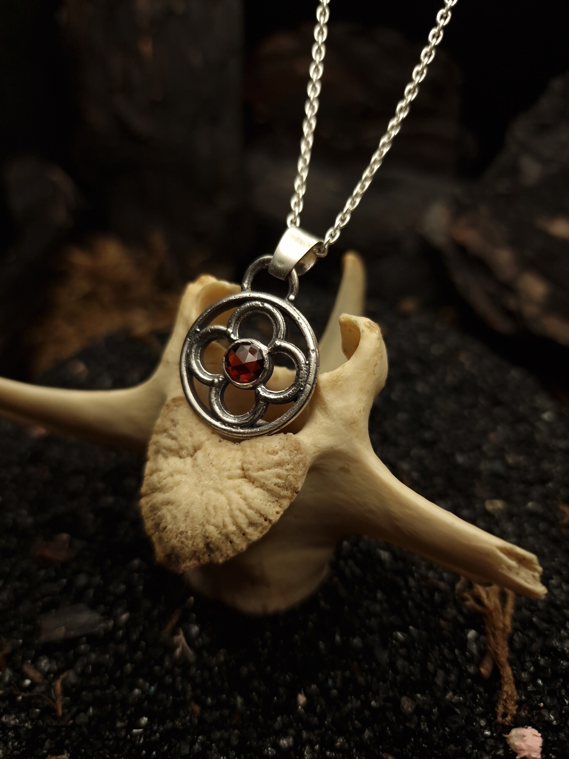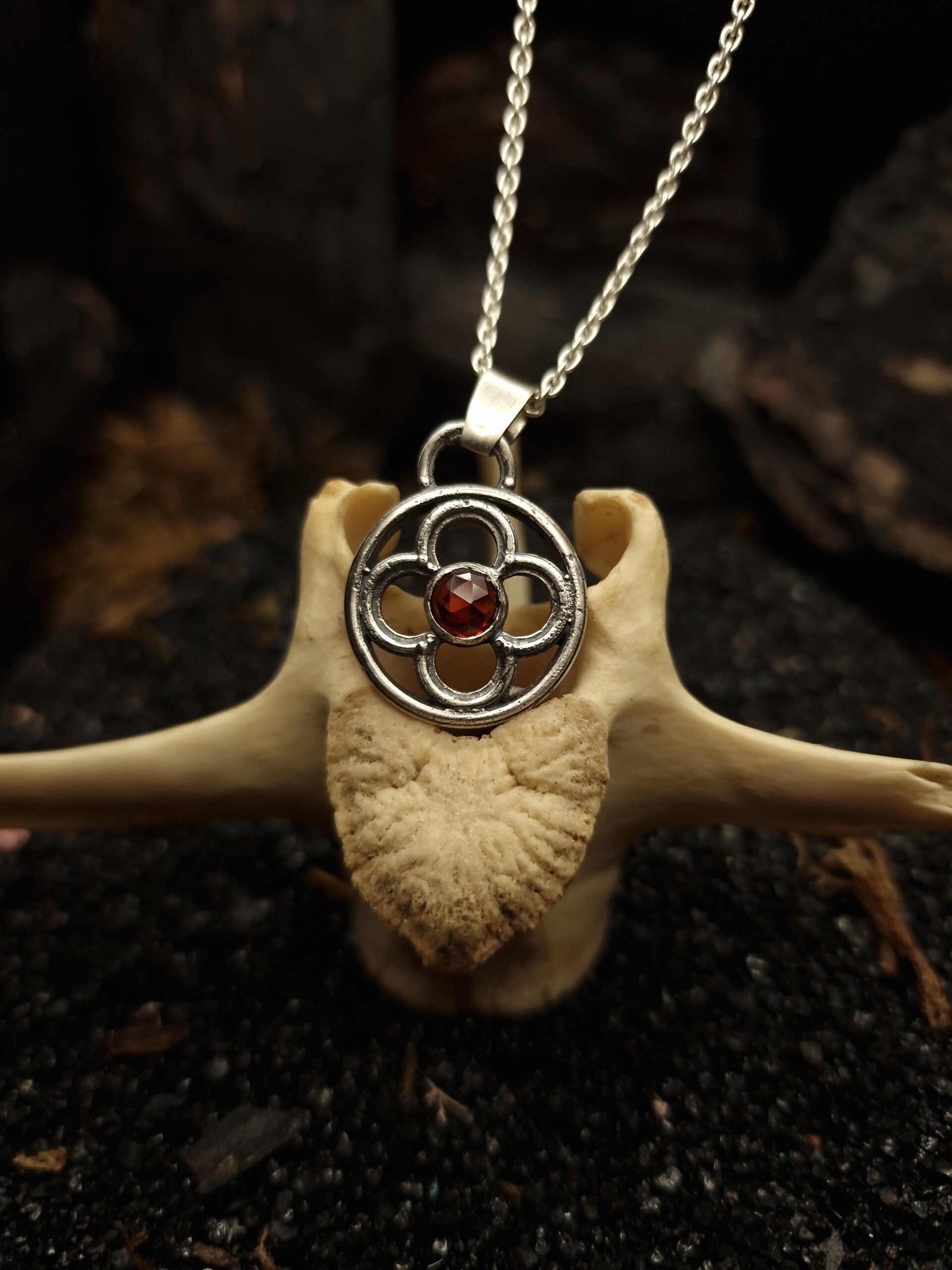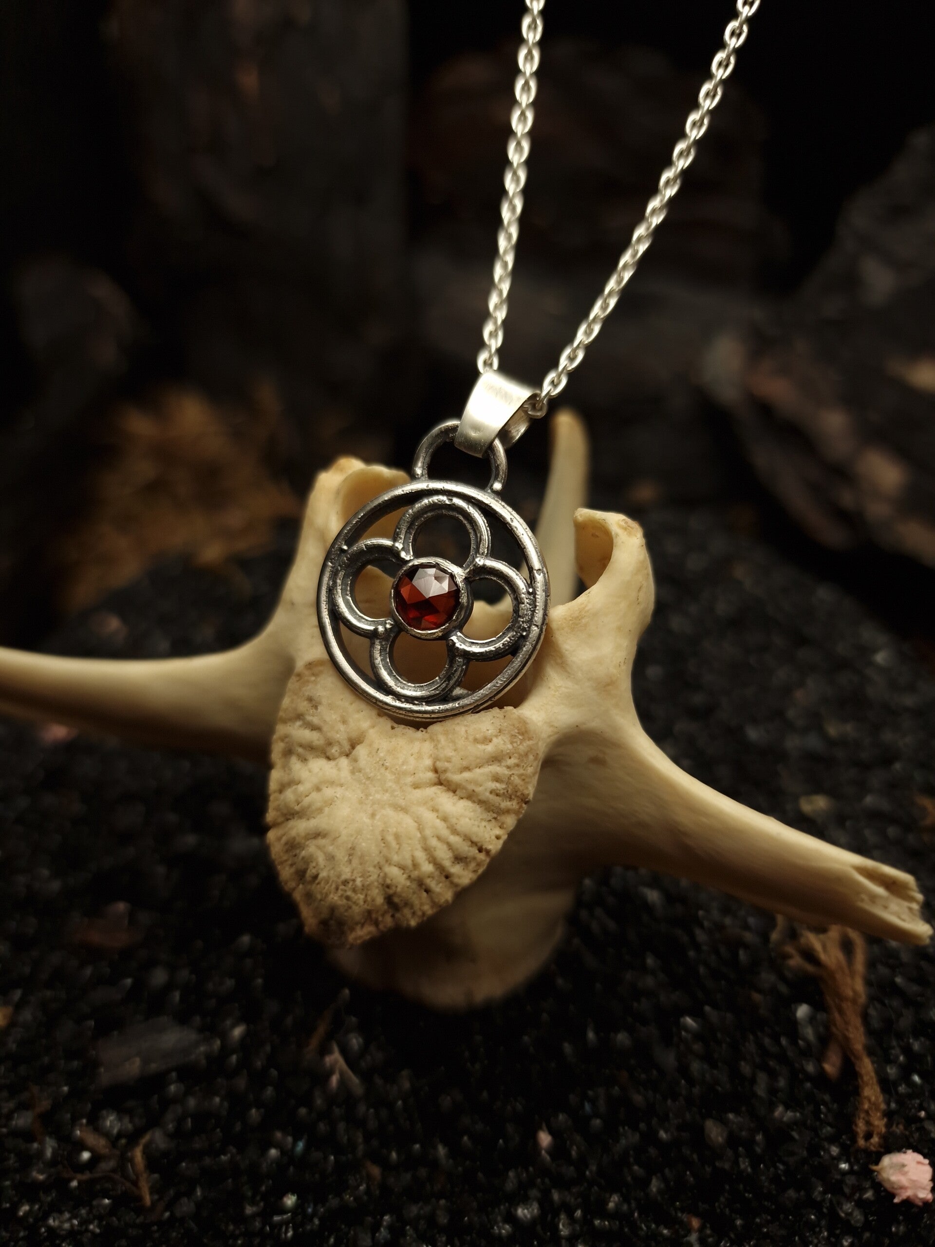 From the heart of Atelier Wolfstone’s Regina Collection comes the Blood Rose Pendant with garnet — a darkly romantic homage to gothic florals and royal passion. Handcrafted in sterling silver, this pendant blooms with baroque elegance, while the deep red garnet burns like a secret vow whispered beneath cathedral arches. For those who rule in velvet, lace, and shadow.