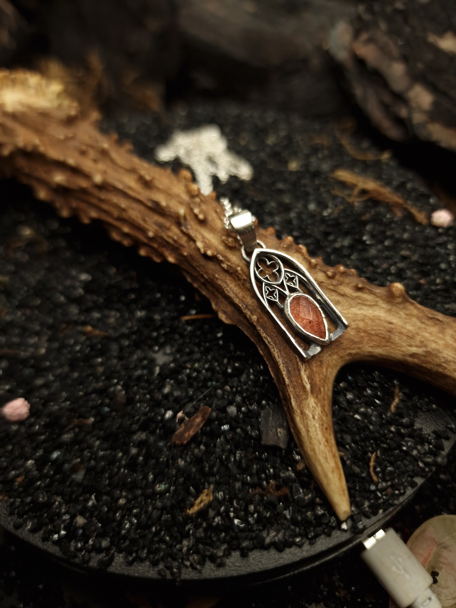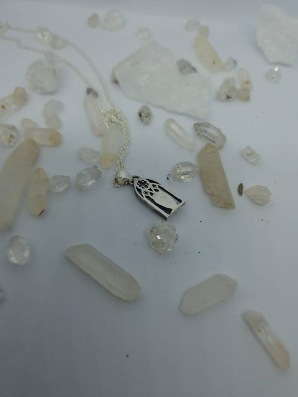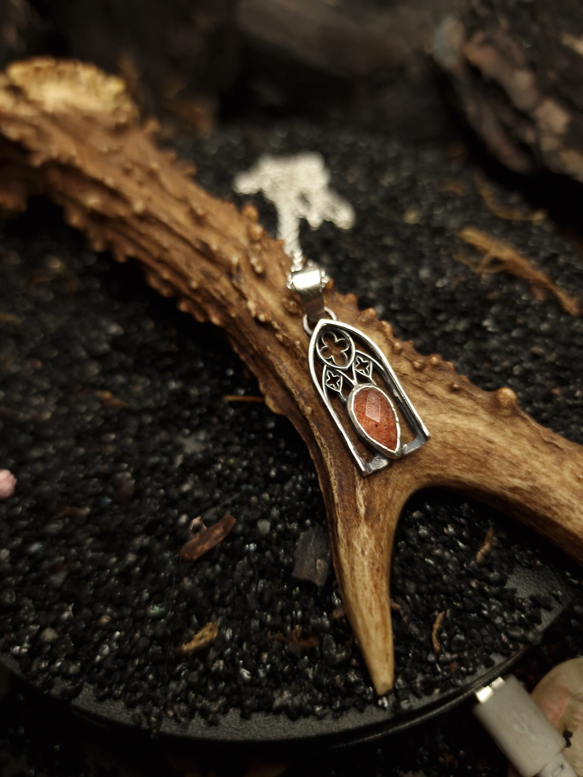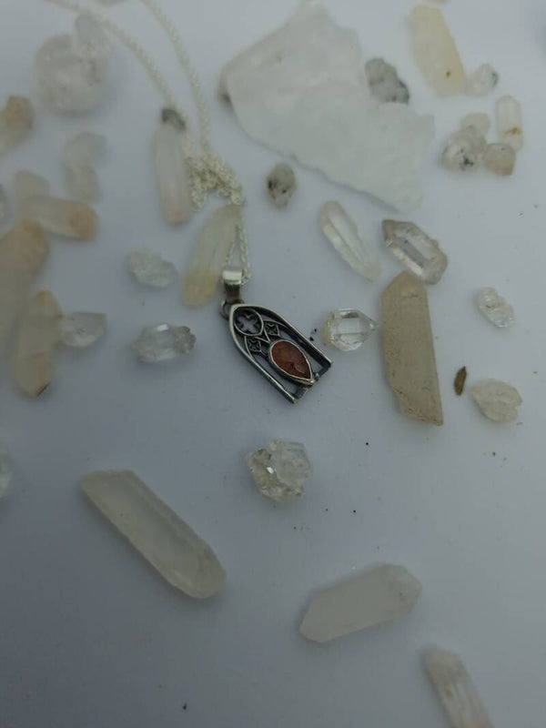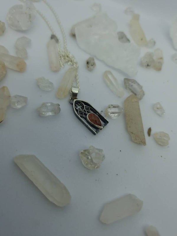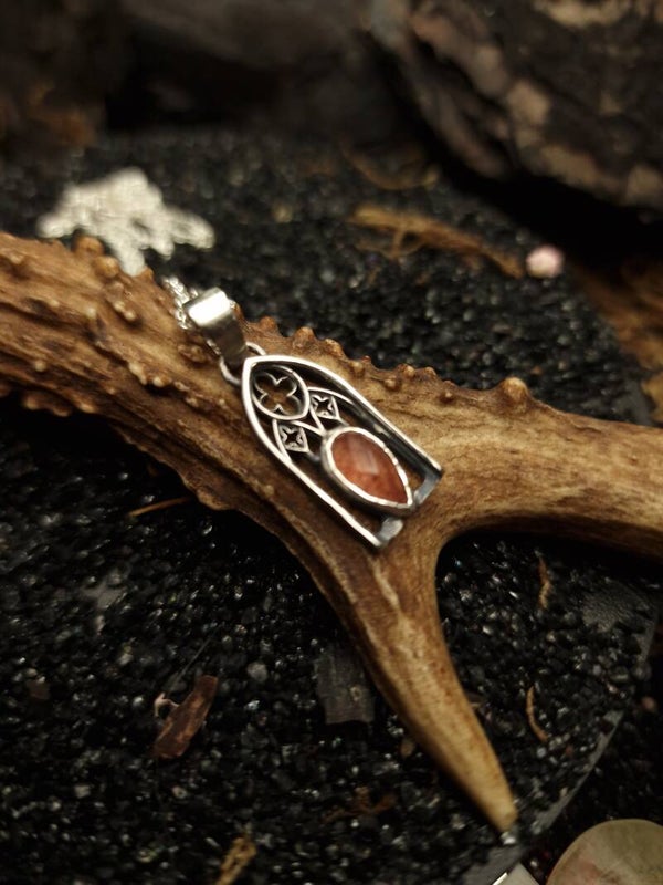 A haunting highlight of Atelier Wolfstone’s Regina Collection, The Bloody Window Pendant with blood quartz evokes the drama of cathedral stained glass bathed in twilight. Hand-forged in sterling silver, this piece channels gothic architecture and sacred intensity through the fiery veins of hematoid quartz — a stone of passion, power, and ancient magic. For those who rule in velvet, lace, and shadow.