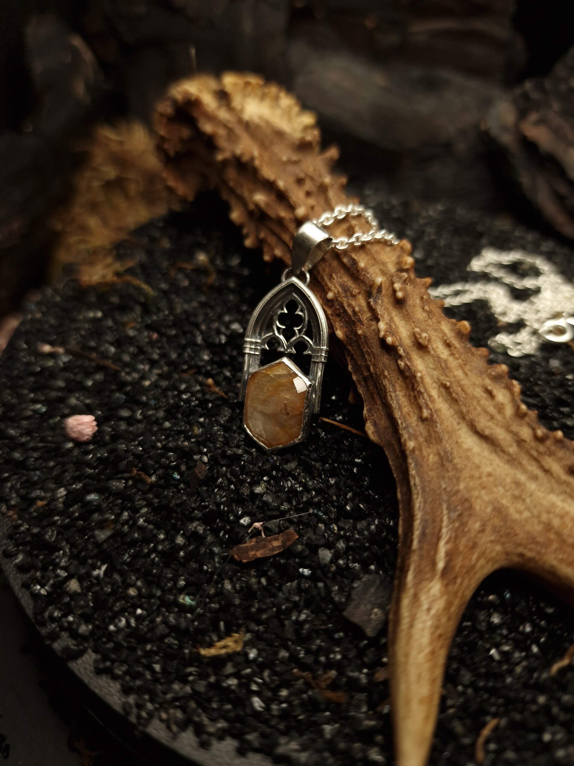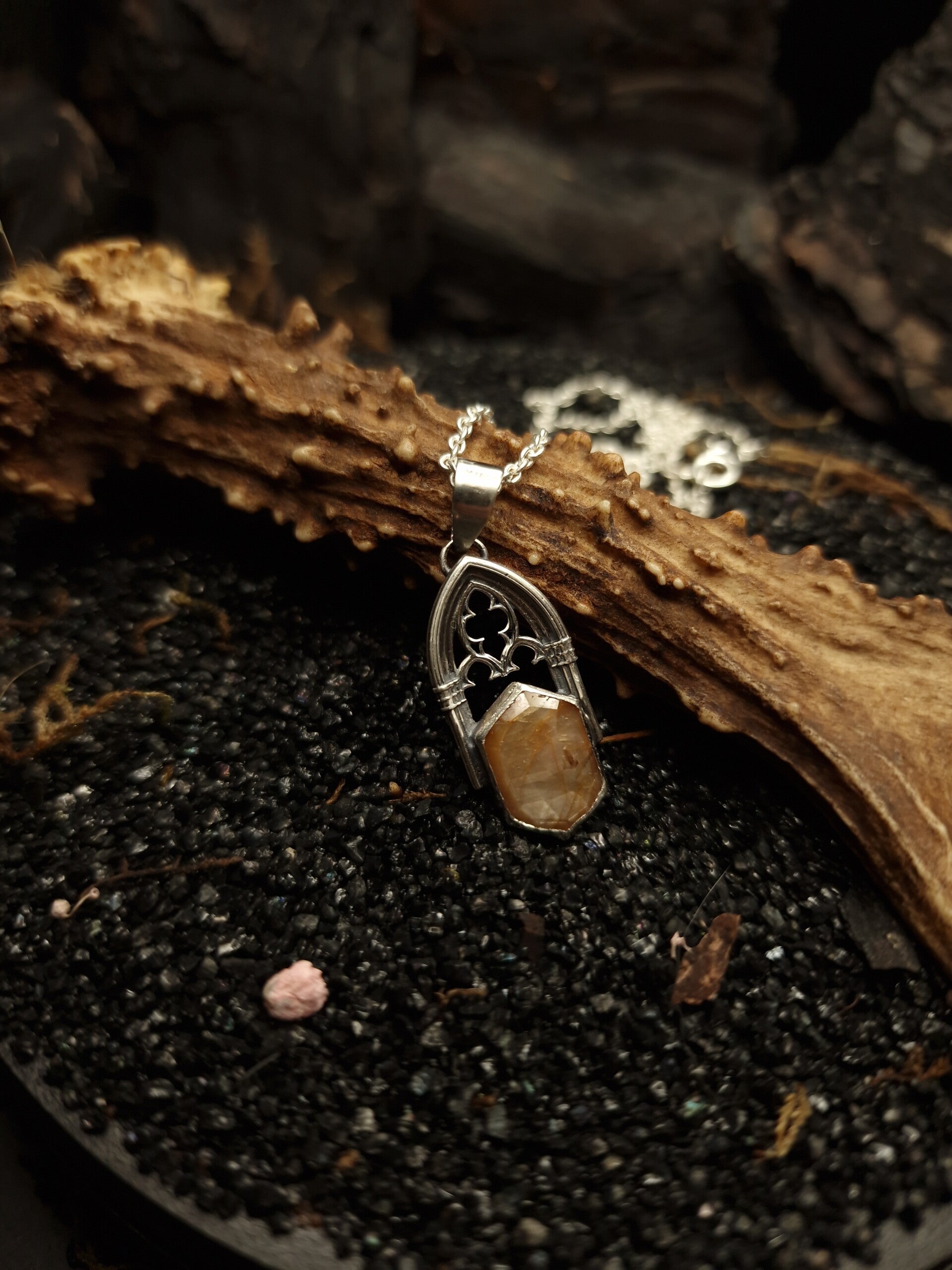 From Atelier Wolfstone’s Regina Collection, The Cathedral’s Spring Garden Pendant with peach sapphire captures the soft rebirth of gothic beauty in bloom. Handcrafted in sterling silver, this piece weaves the elegance of cathedral architecture with the tender warmth of peach sapphire — a rare gem that glows like dawn through stained glass. For those who rule in velvet, lace, and shadow, even in spring.