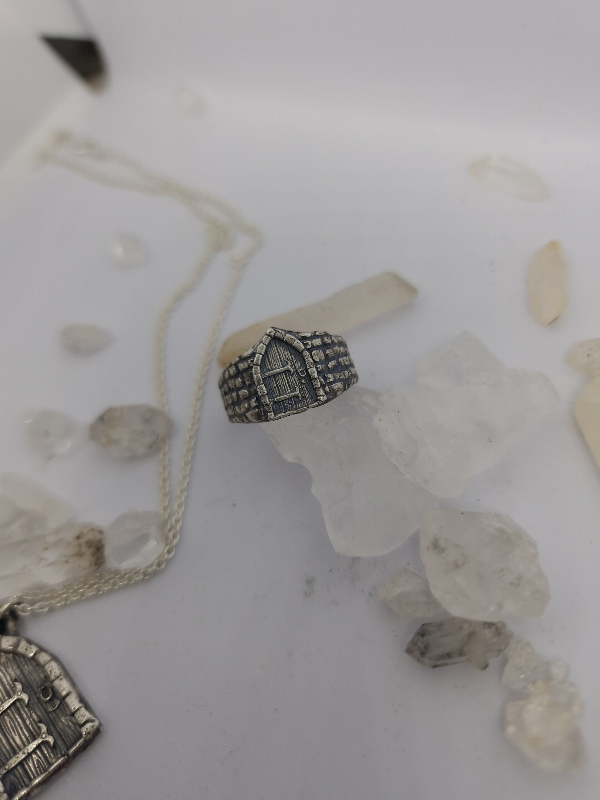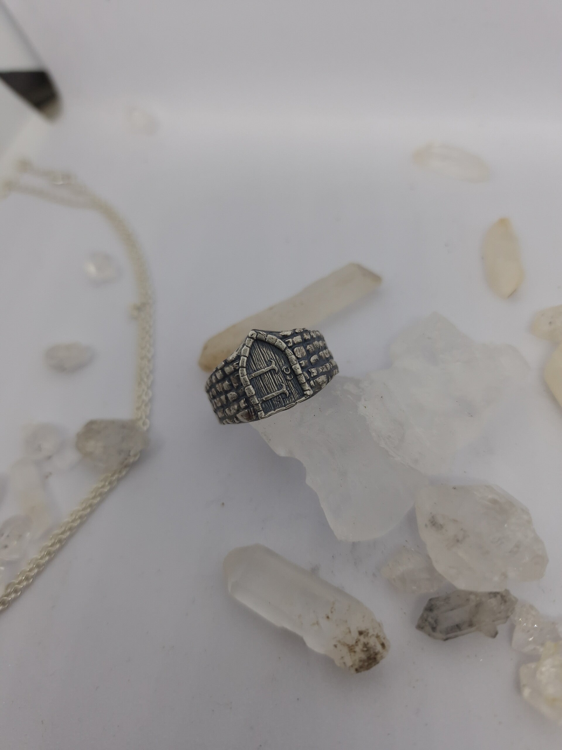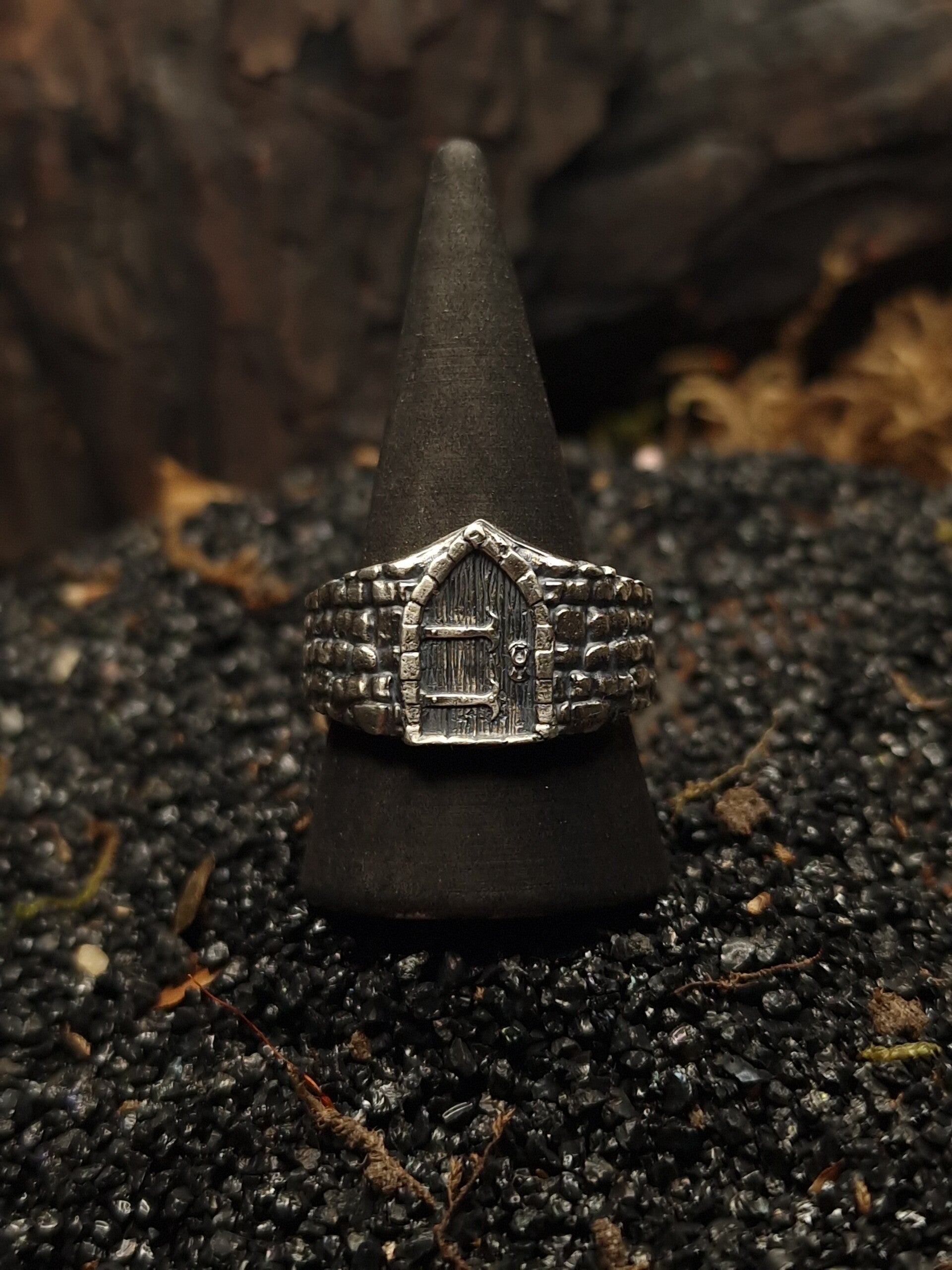 A made to order sterling silver signet ring inspired by medieval stone walls and wooden doors, perfect for fantasy, knightcore, and medieval revival enthusiasts.