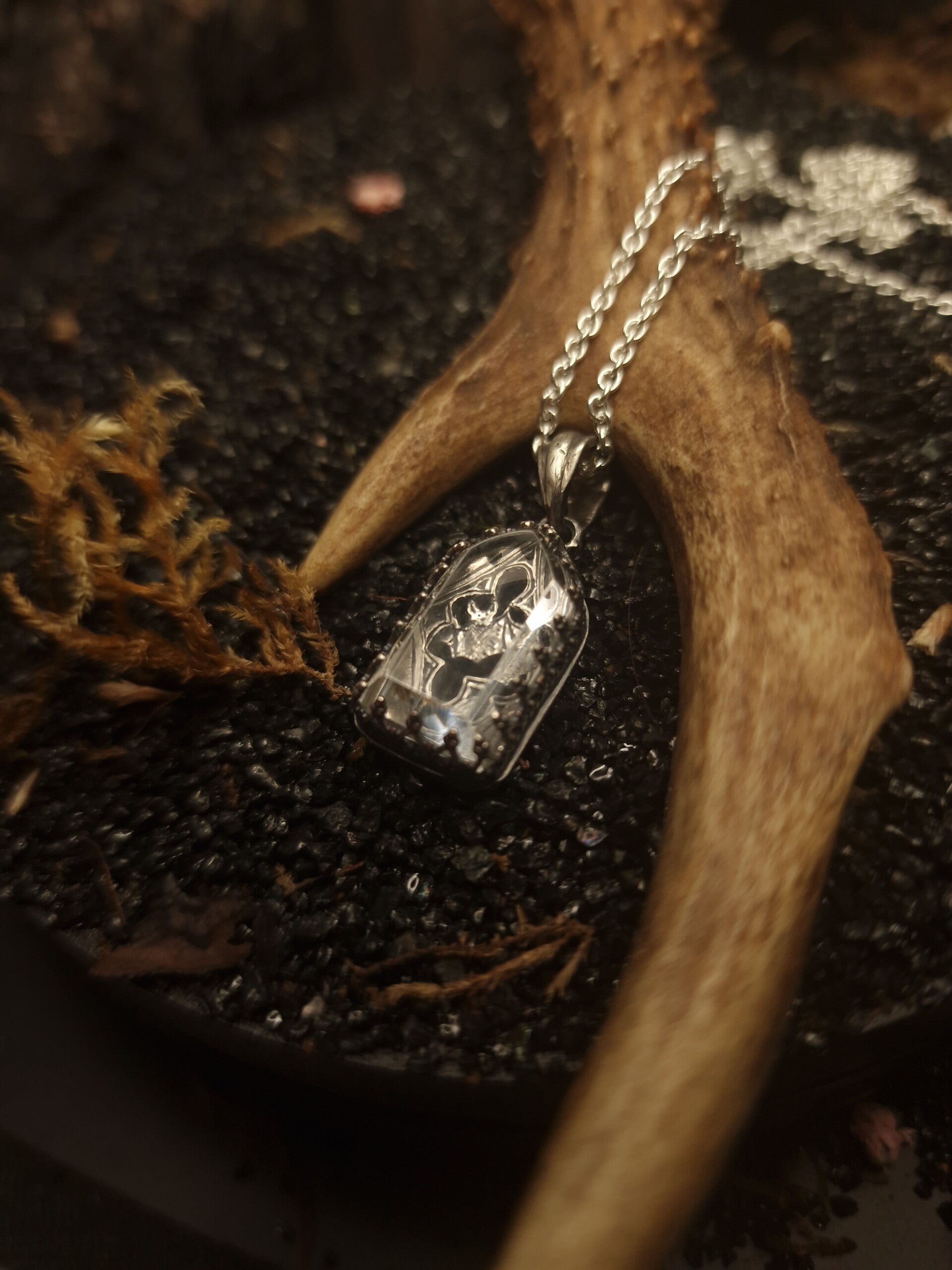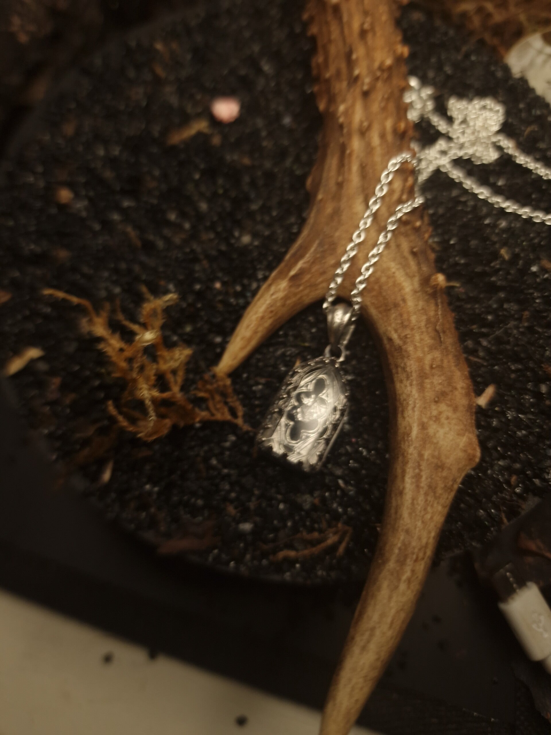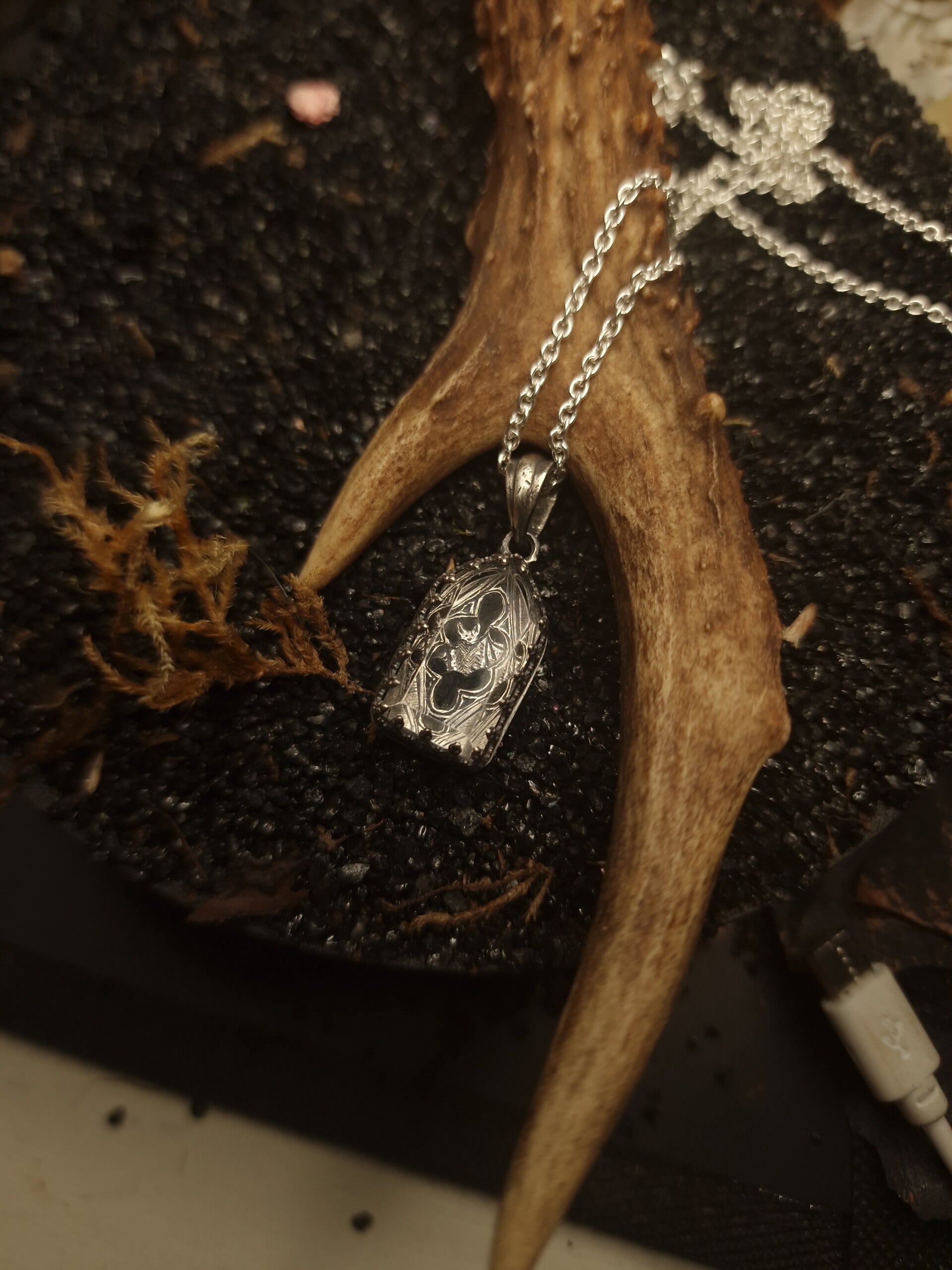 The standard price does not include a sterling silver necklace. Instead, the pendant comes with a faux leather cord. Many people already have silver necklaces at home, which can easily be paired with this pendant for a personalized touch. We apply this principle to all pendants where the design allows it, thanks to the inclusion of a bail. Please note that this option does not apply to every necklace design.