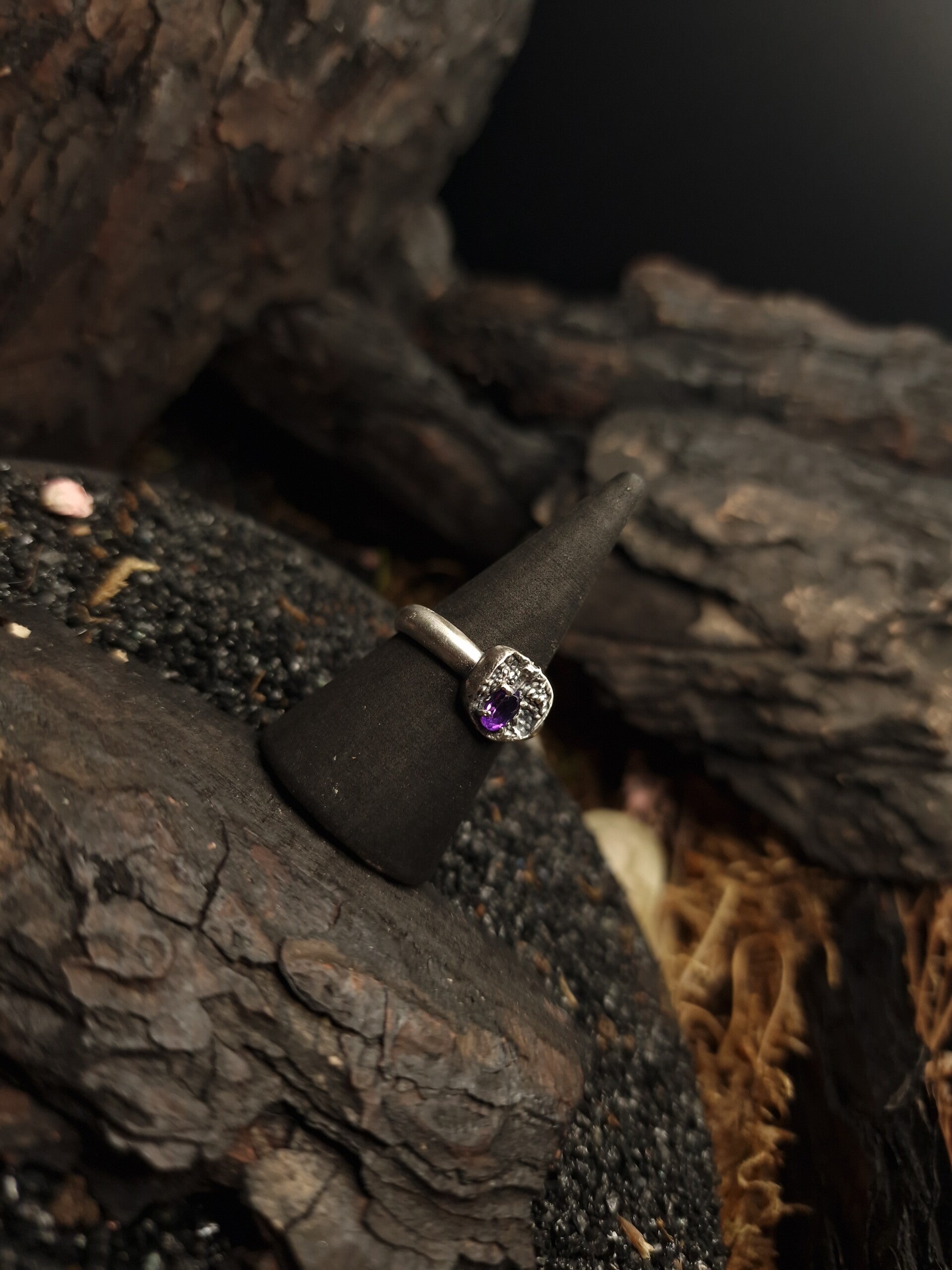 A one-of-a-kind handcrafted jewelry piece, sterling silver ring featuring a central amethyst, inspired by abundance, occult symbolism, and whimsygoth aesthetics.