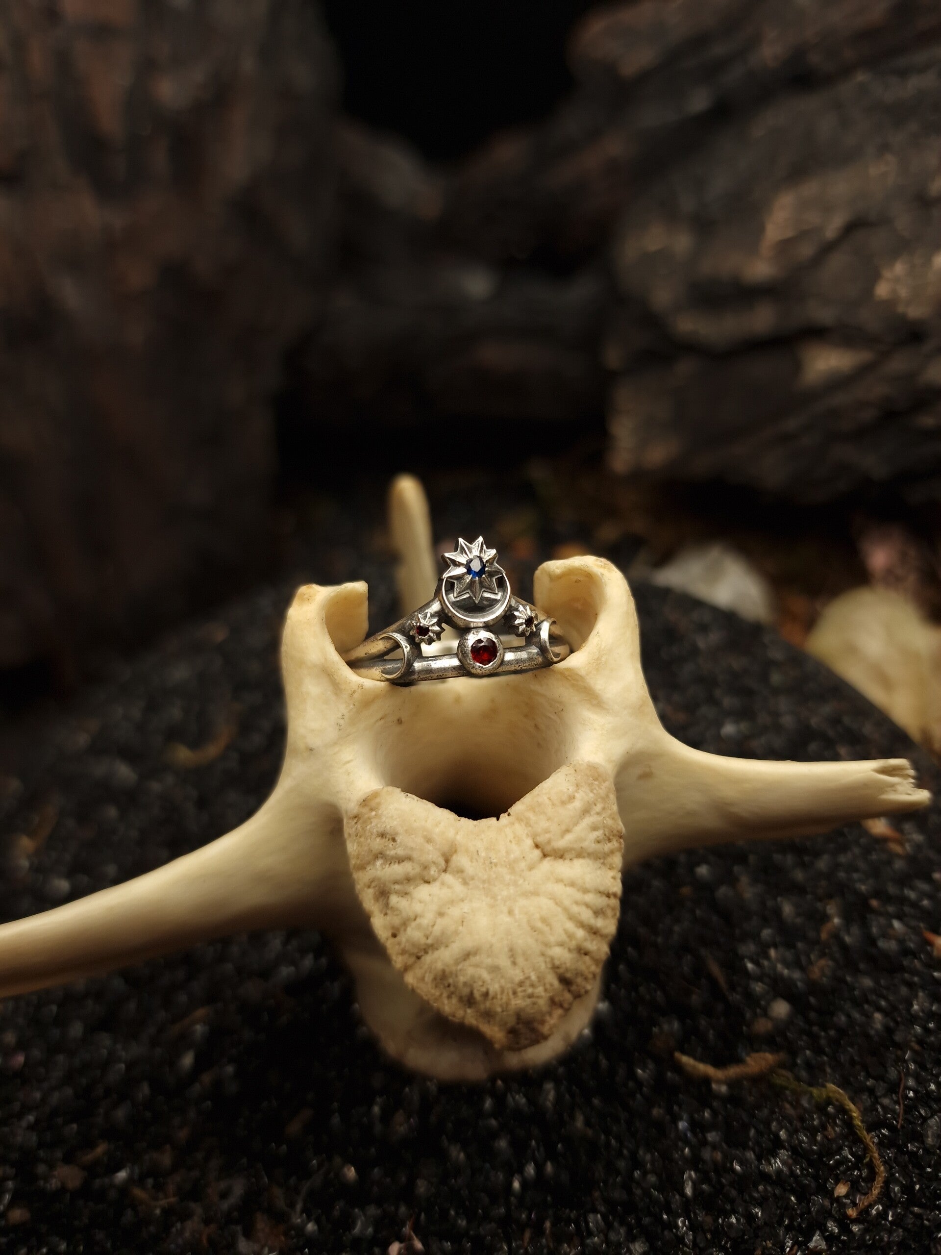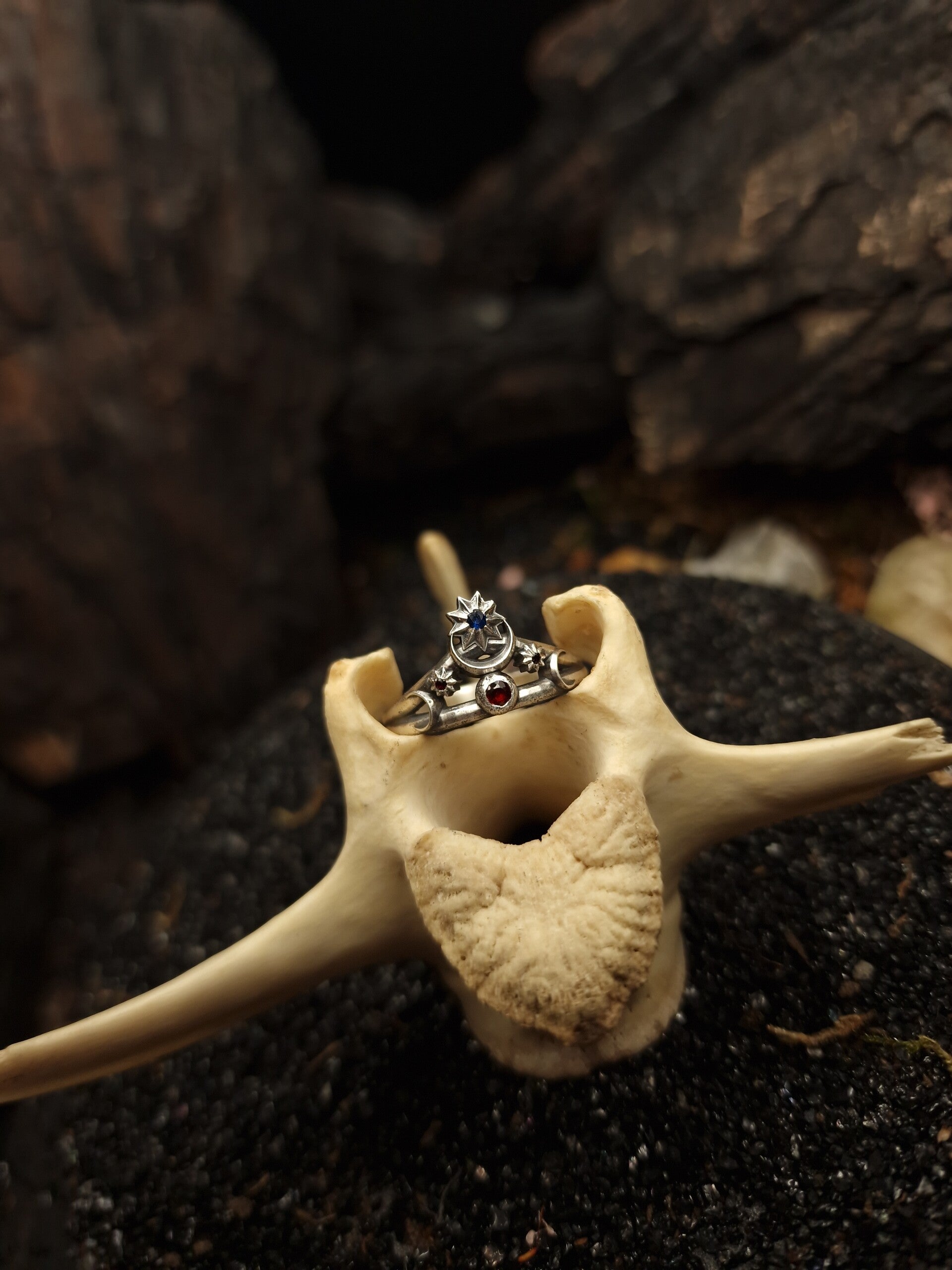 Celestial Bookish Gothic Ring with Sapphire & Garnet