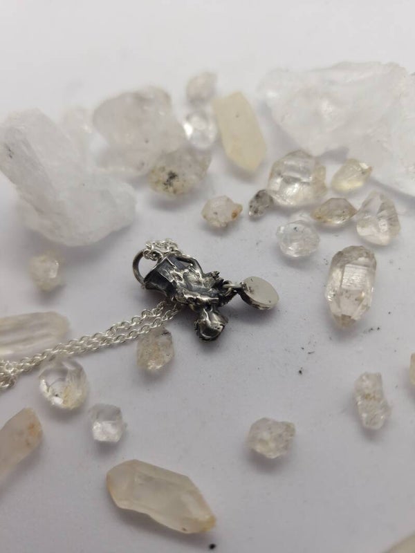 The standard price does not include a sterling silver necklace. Instead, the pendant comes with a faux leather cord. Many people already have silver necklaces at home, which can easily be paired with this pendant for a personalized touch. We apply this principle to all pendants where the design allows it, thanks to the inclusion of a bail. Please note that this option does not apply to every necklace design.