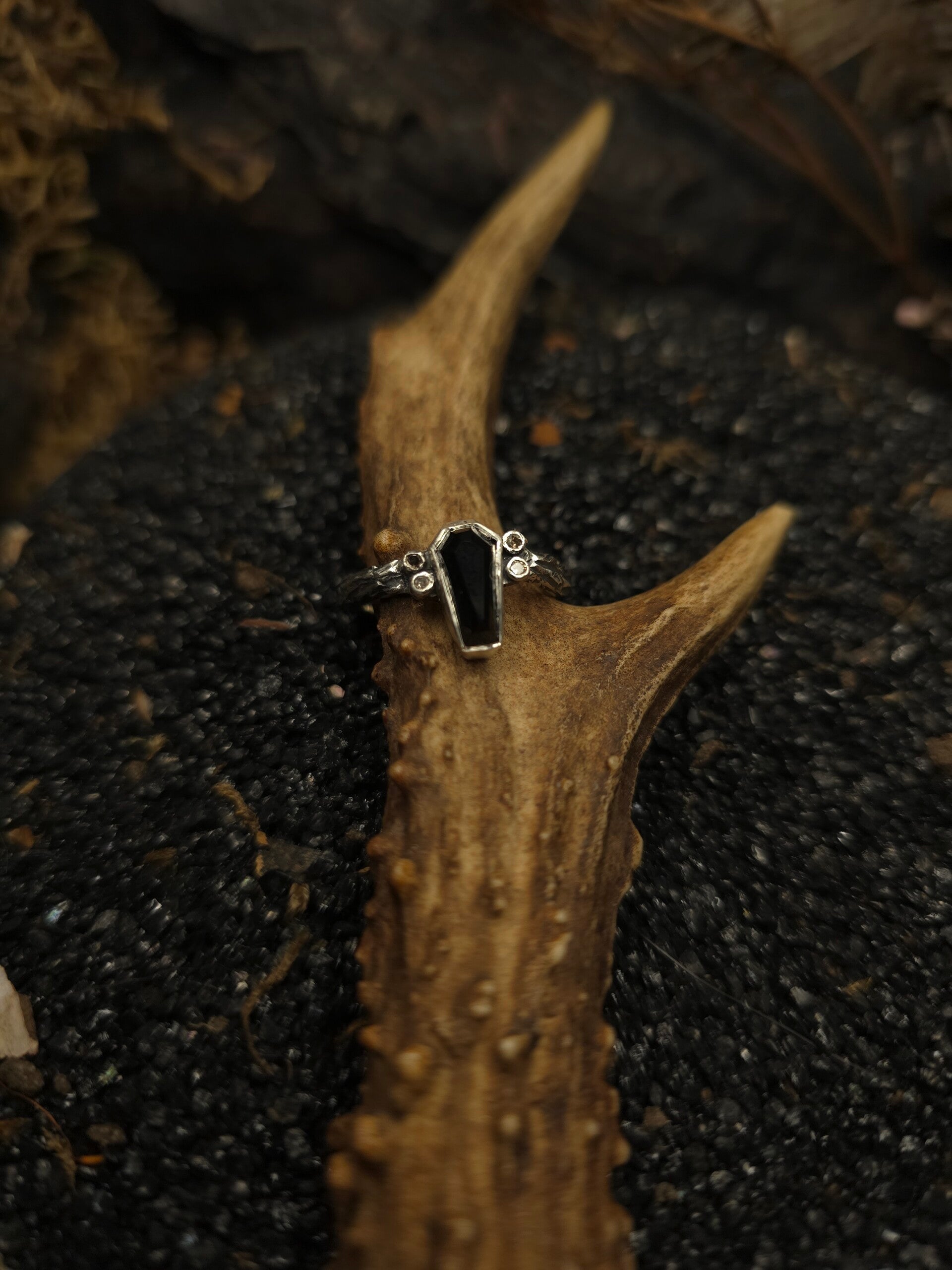 Handcrafted one-of-a-kind ring made from recycled 925 sterling silver, featuring a central onyx coffin and four champagne diamonds set in an intentionally raw, gothic composition.