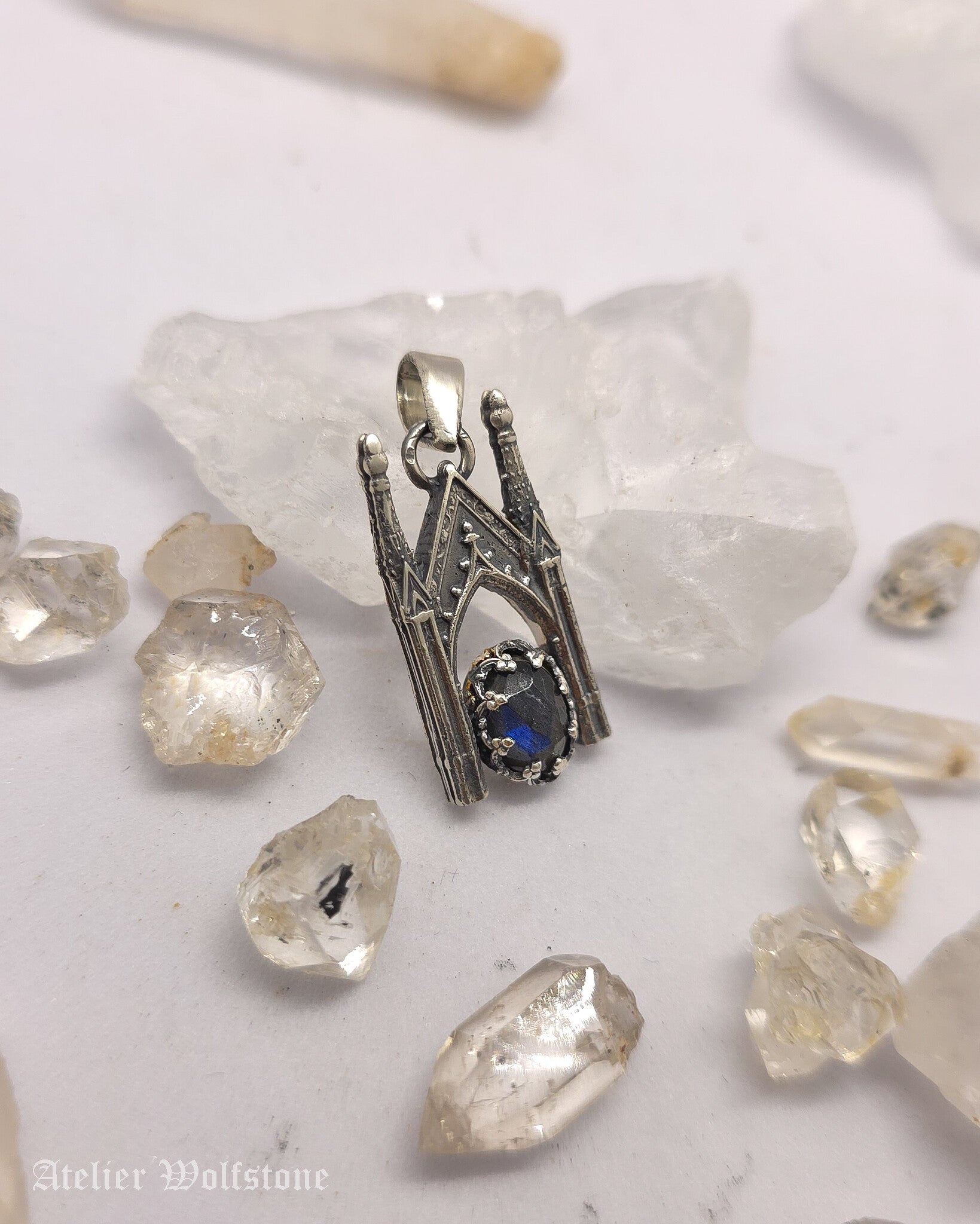 At the center of this piece sits a dark labradorite, glowing with a deep blue flash like moonlight slipping through a crypt window. The stone’s shifting light mirrors the way night plays across old stone, making the pendant feel alive, atmospheric and deeply gothic.