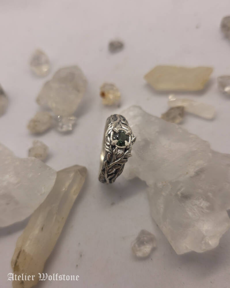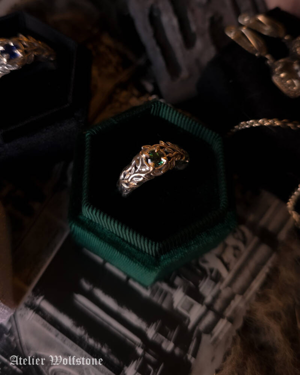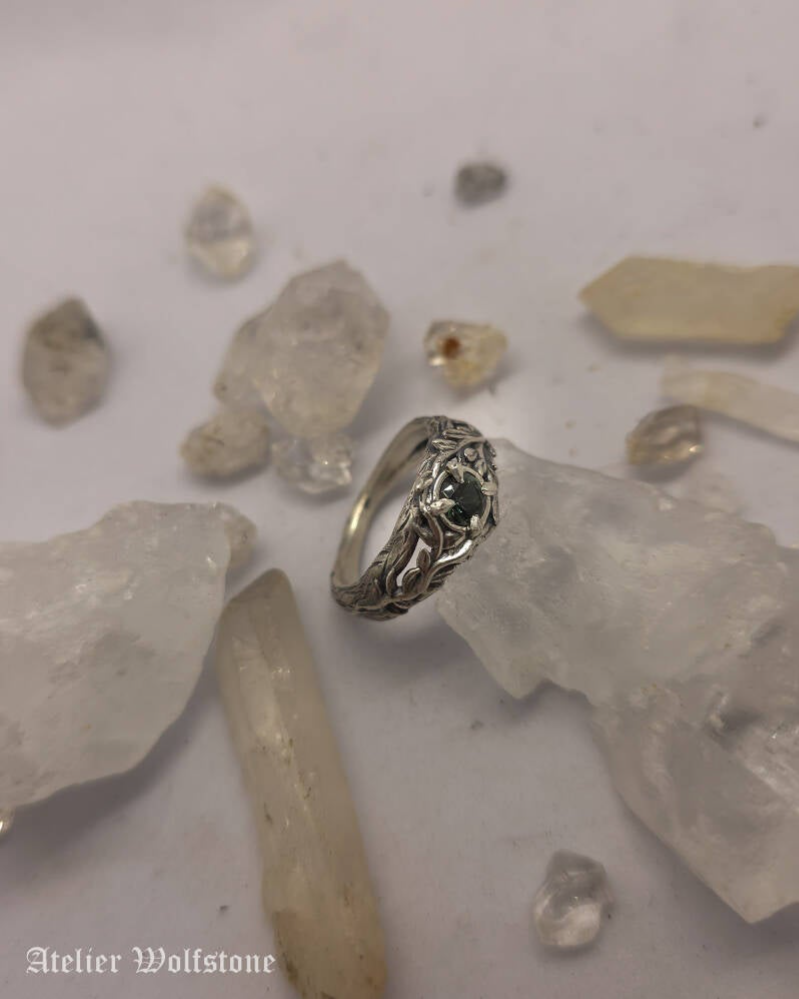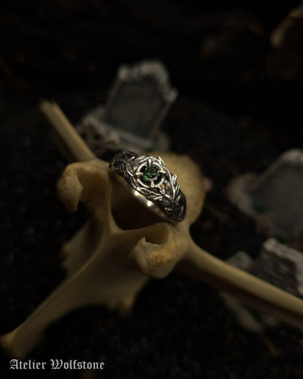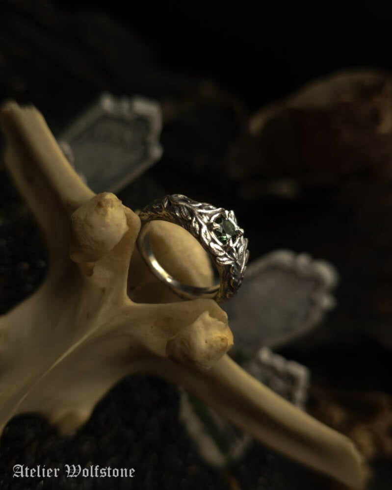At the center of the ring sits a Dark green Spinel, acting as the heart of the piece, like a relic discovered in the middle of an overgrown graveyard. The stone is framed by botanical silverwork that feels wild, untamed and slightly grim, echoing the atmosphere of forgotten graves hidden beneath vines and moss.