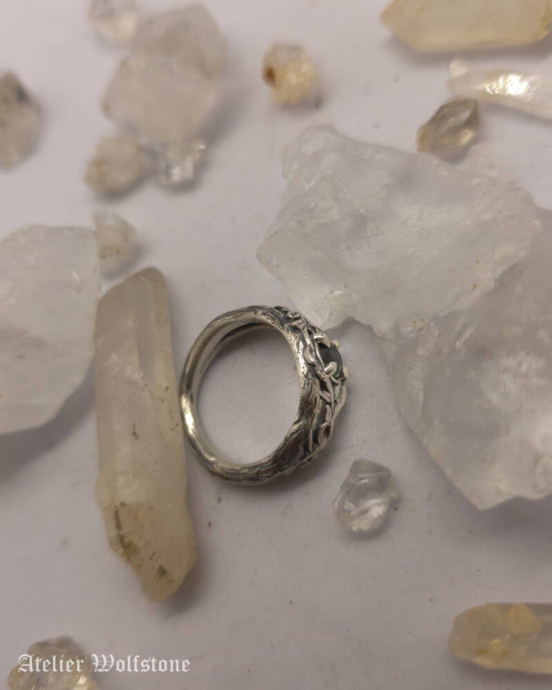 At the center of the ring sits a Dark green Spinel, acting as the heart of the piece, like a relic discovered in the middle of an overgrown graveyard. The stone is framed by botanical silverwork that feels wild, untamed and slightly grim, echoing the atmosphere of forgotten graves hidden beneath vines and moss.